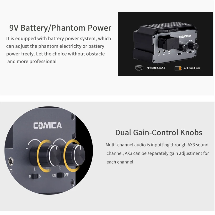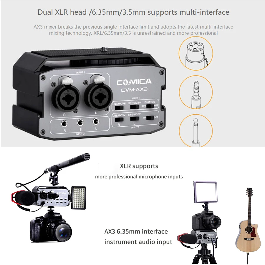 - Product name : COMICA CVM-AX3 Dual XLR/6.35MM/3.5MM Microphone Audio Mixer Adapter for Canon Nikon DSLR camera cam